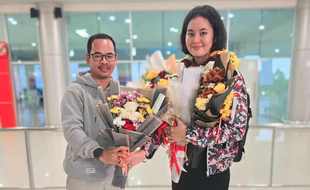 Plt. Kabid Pembinaan Ketenagaan Disdik Kalteng Juliansyah (kiri) saat mewakili Plt. Kadisdik Kalteng Muhammad Reza Prabowo menyambut kedatangan Kachina Ozora (kanan) di Bandara Tjilik Riwut. (Foto: Istimewa)